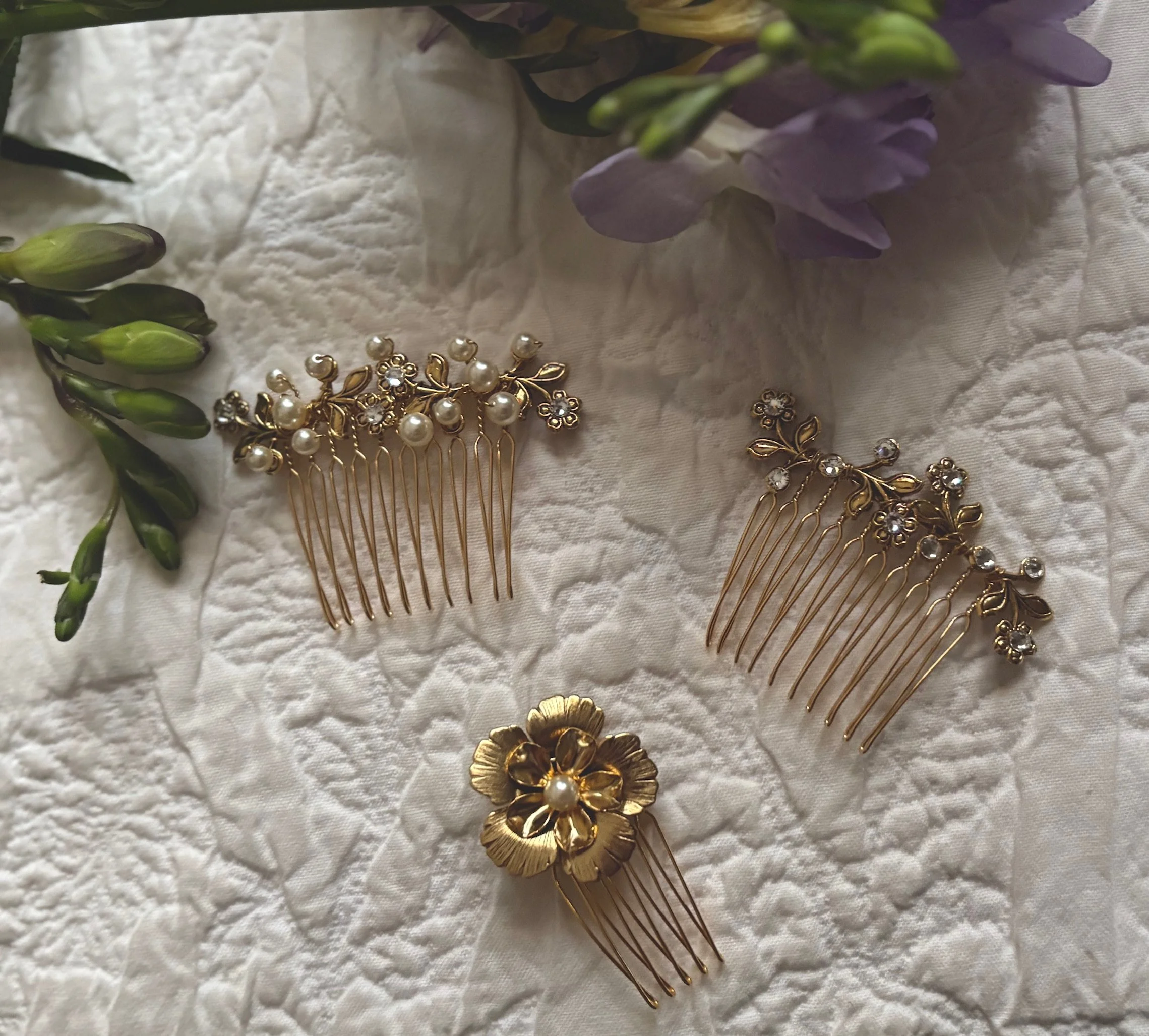 Fun and flirty pearls are a favorite this season and the antique gold accents with tiny Swarovski® crystal centers make for a light and lovely hair accessory